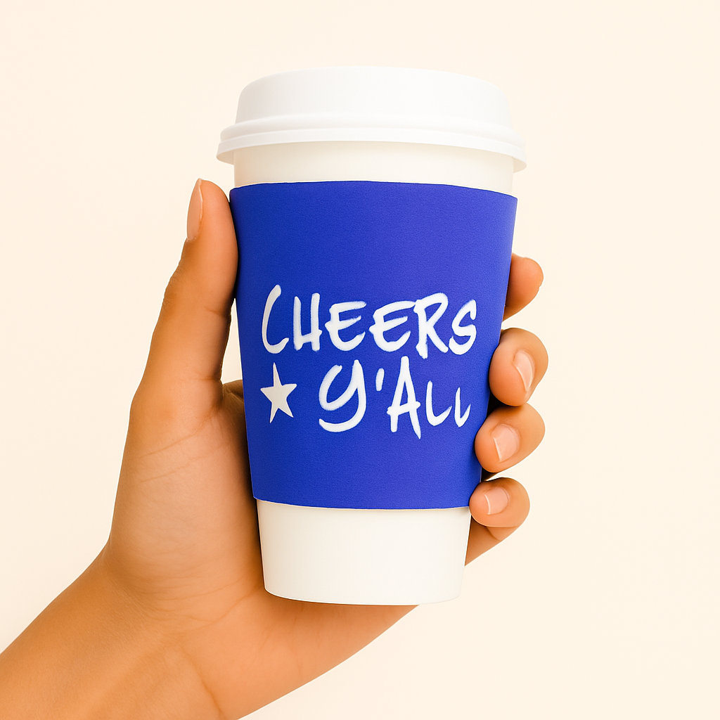 Cheers y'all! Americana for everyone. The Cheers Y'all Cup Sleeve is created with blue neoprene, white text and a white outer seam. The Cheers Y'all Cup Sleeve will fit any standard 16 oz. to go cup as well as tumbler, pint glasses, and more.