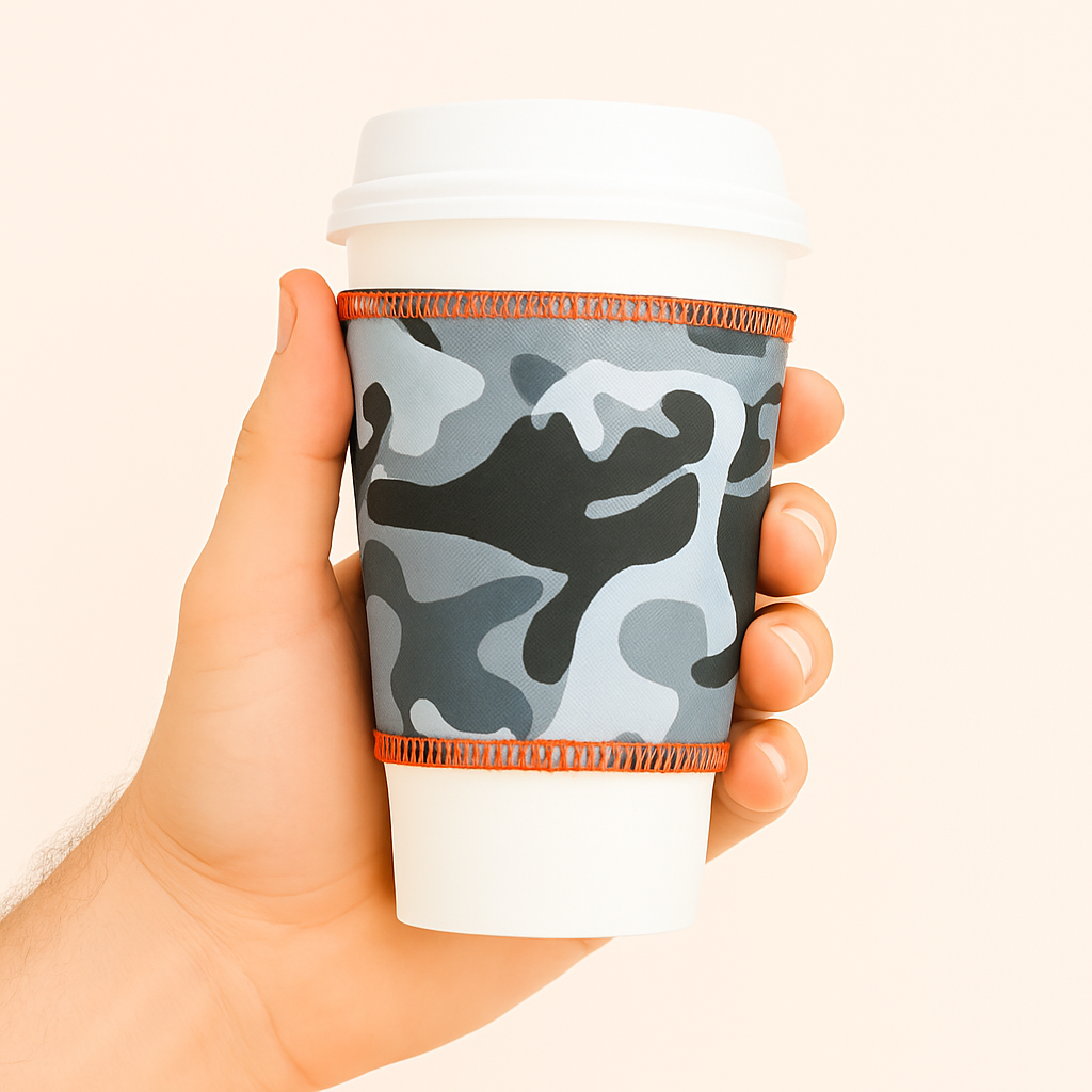 This Gray Camo Cup Sleeve style is available in 12 oz. Regular and Cup Sleeve.